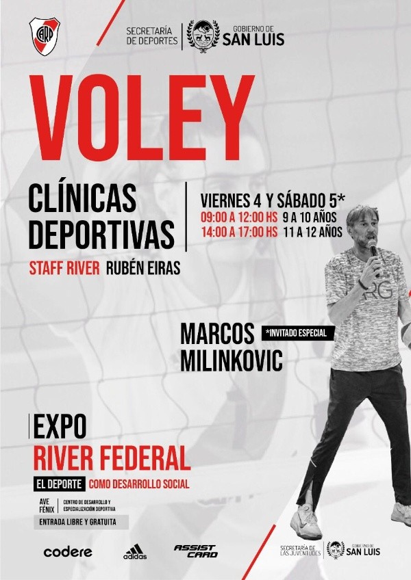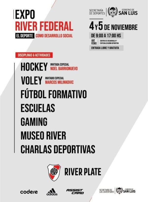 Así nació la idea de “Expo River Federal”, una feria que contará con la participación de varias áreas de la institución, entre ellas el Departamento Físico, Escuelas River, Fútbol Formativo, Museo River y el equipo de River Gaming. El primer evento se llevará a cabo el 4 y 5 de noviembre en el Centro de Desarrollo y Especialización Deportiva “Ave Fénix” en San Luis. Las jornadas se extenderán de 9 a 17 horas.