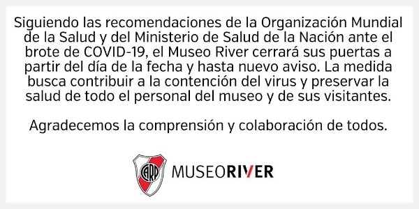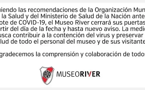 Las medidas para luchar contra el coronavirus siguen avanzando y River dio otro paso para acatar las recomentaciones del Ministerio de la Salud de la Nación. El Museo River permanecerá cerrado hasta nuevo aviso a causa de la pandemia y el ente sacó un comunicado oficial al respecto.