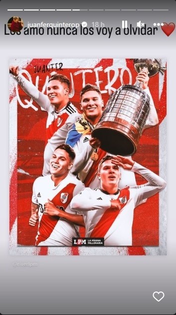 La Página Millonaria le dedicó a Juanfer un posteo especial en Instagram para desearle “el mayor de los éxitos en todo lo que venga en tu carrera y tu vida. Te vamos a estar apoyando y esperando”. Y el colombiano compartió la publicación para saludar a todos los hinchas de River con una respuesta contundente: “Los amo, nunca los voy a olvidar”. Nosotros tampoco.
