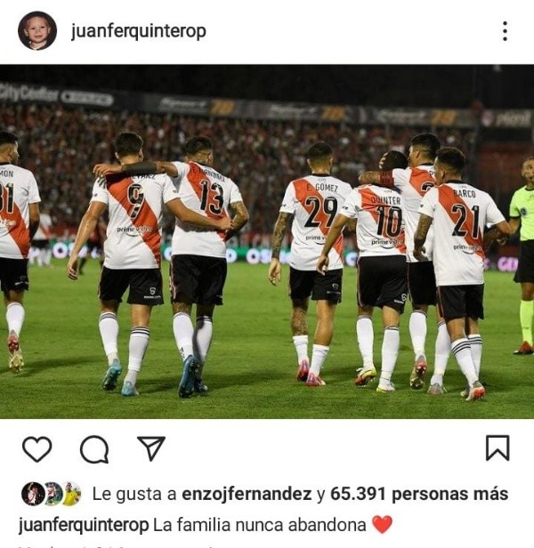 Un día después, apareció un nuevo integrante del plantel profesional para respaldar a sus compañeros. Juan Fernando Quintero, que no logró recuperarse a tiempo y vivió el encuentro ante Tigre desde la puerta del vestuario, publicó un mensaje en sus redes sociales para bancar a los jugadores del Más Grande en un momento difícil: “La familia nunca abandona”, fue el corto pero contundente posteo del crack colombiano.