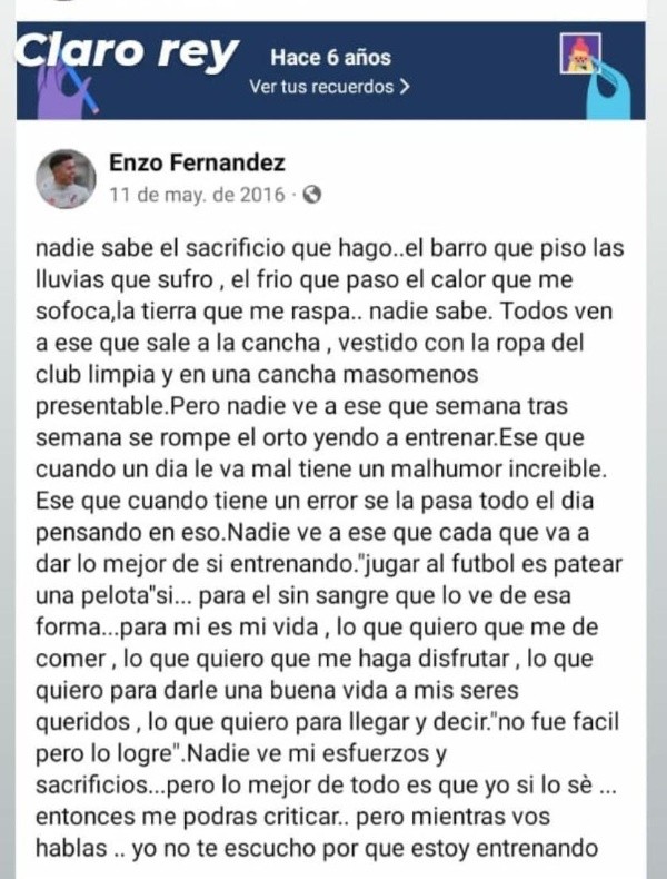 “Nadie sabe del sacrificio que hago…el barro que piso, las lluvias que sufro, el frío que paso, el calor que me sofoca, la tierra que me raspa…nadie sabe. Todos ven a ese que sale a la cancha vestido con la ropa del club limpia y en una cancha más o menos presentable, pero nadie ve a ese que semana tras semana se rompe el orto yendo a entrenar. Ese que cuando un día le va mal tiene un malhumor increíble. Ese que cuando tiene un error se la pasa todo el día pensando en eso. Nadie ve a ese que va a dar lo mejor de sí entrenando. ‘Jugar al fútbol es patear una pelota’…sí, para el sin sangre que lo ve de esa forma. Para mí es mi vida, lo que quiero que me dé de comer, lo que quiero que me haga disfrutar, lo que quiero para darle una buena vida a mis seres queridos, lo que quiero para llegar y decir ‘no fue fácil pero lo logré’. Nadie ve mis esfuerzos y sacrificios…pero lo mejor de todo es que yo sí lo sé. Entonces me podrás criticar, pero mientras vos hablás…yo no te escucho porque estoy entrenando”, posteó Enzo Fernández el 11 de mayo de 2016 en su cuenta de Facebook.