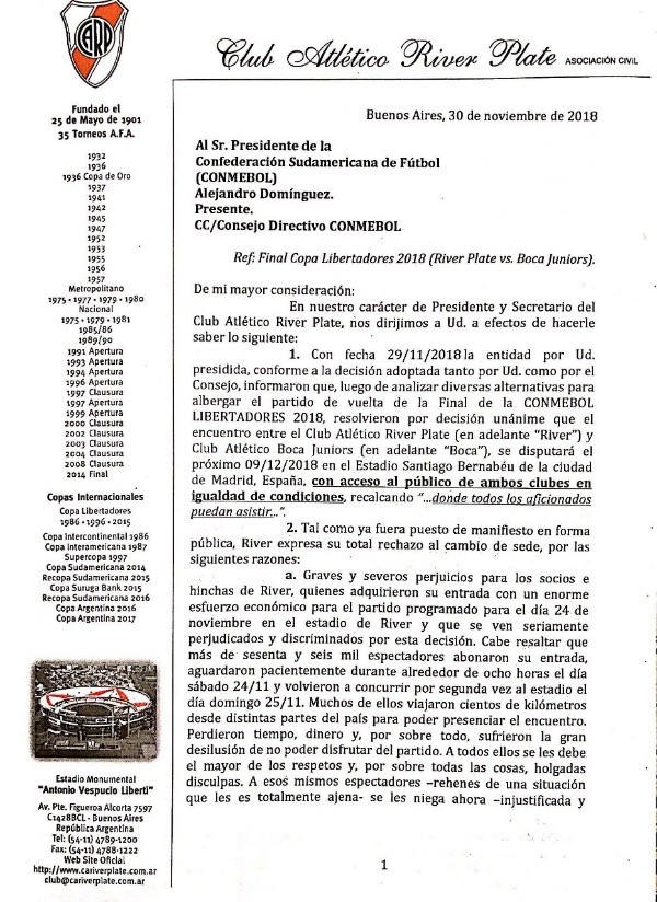 El castigo de no poder jugar el partido devuelta de la final de América en el estadio Monumental fue doloroso e injusto para todo el mundo River. Es por ésto que el club elevó esta mañana un fuerte descargo hacia la entidad madre del fútbol sudamericano.