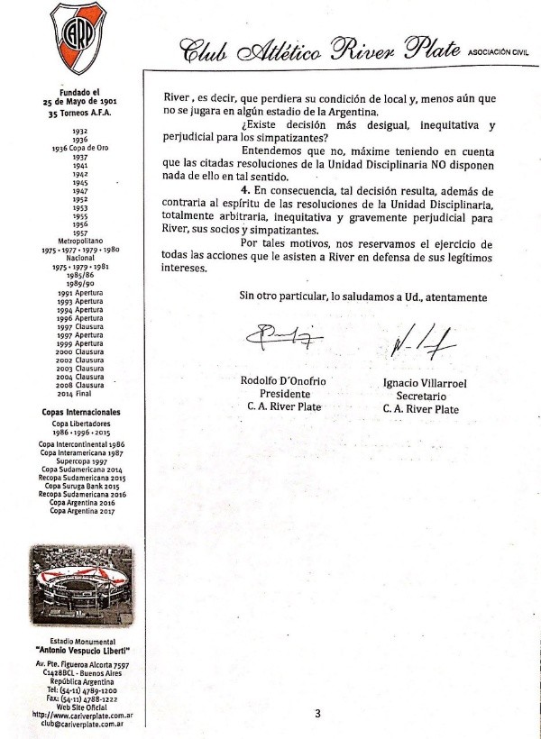 El descargo completo de River a la Conmebol: