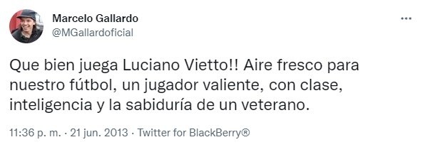 El 21 de junio de 2013 Racing enfrentó a Unión por la última fecha del Torneo Final 2013 en el Cilindro, por aquel entonces Marcelo Gallardo ya había vivido su primera experiencia como director técnico en Nacional de Montevideo y en ese momento se encontraba sin club y formándose para cuando le llegue una oportunidad que lo seduzca, la misma llegó un año más tarde para que se haga cargo de River, su casa. Pero también en junio de 2013 el Muñeco utilizaba Twitter –algo que ya no hace- y la noche del 21 mientras jugaba Racing publicó en su cuenta: “Que bien juega Luciano Vietto!! Aire fresco para nuestro fútbol, un jugador valiente, con clase, inteligencia y la sabiduría de un veterano”.