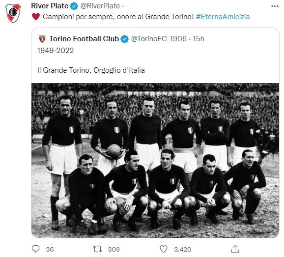 Este miércoles el Torino en su cuenta oficial de Twitter compartió una foto de aquel mítico plantel de 1949 y escribió: “1949-2022. El gran Torino, orgullo de Italia”. River, también desde su cuenta oficial de dicha red social respondió con gran cariño: “Campeones por siempre, honor al gran Torino. Eterna amistad”. Un muy buen gesto del Millonario que no olvida lo ocurrido.