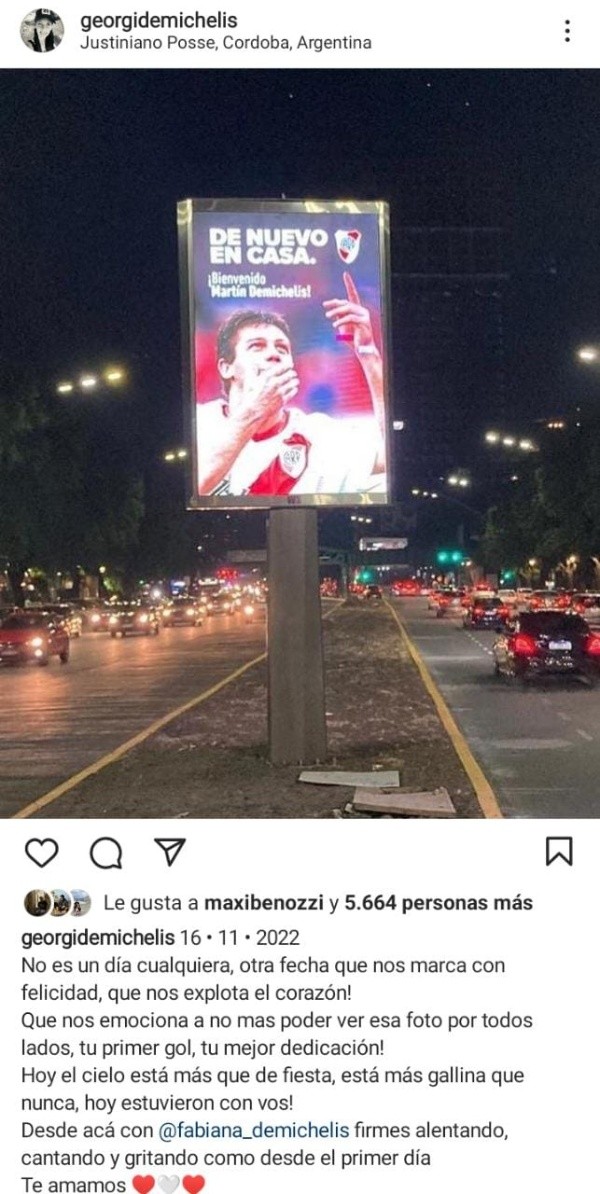 “16-11-2022 no es un día cualquiera. Otra fecha que nos marca con felicidad, que nos explota el corazón. Que nos emociona a más no poder ver esa foto por todos lados, con tu primer gol y tu mejor dedicatoria. Hoy el cielo está más que de fiesta, está más gallina que nunca, ¡hoy estuvieron con vos! Desde acá con Fabiana Demichelis firmes alentando, cantando y gritando como desde el primer día. Te amamos”, fueron las palabras que eligió Georgi Demichelis para celebrar el regreso de Micho a River, su casa y su lugar en el mundo.