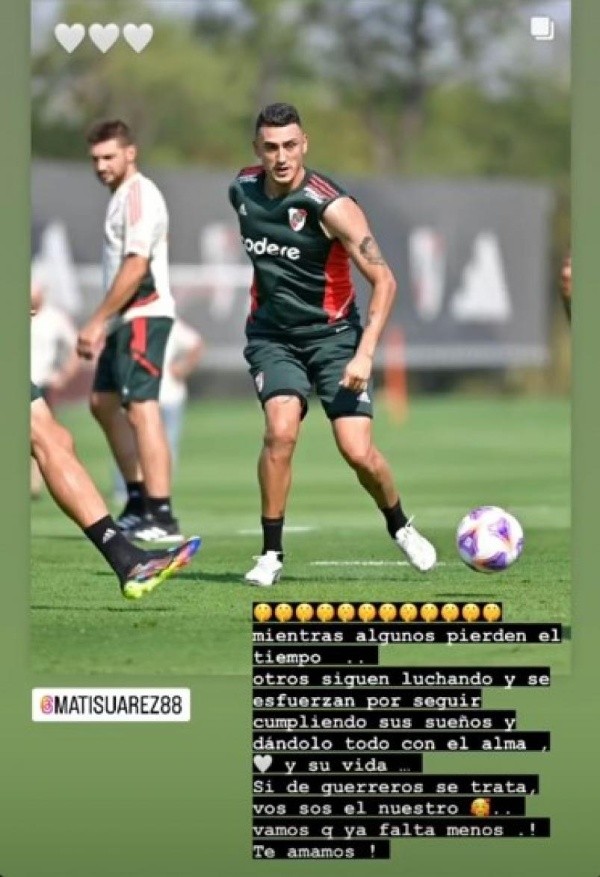 Por primera vez en mucho tiempo, el delantero pudo entrenarse a la par de sus compañeros, con cargas mas livianas, pero participando de los ejercicios que dispuso el cuerpo técnico. Pasaron más de cuatro meses del último partido oficial que disputó el cordobés: fue el 23 de octubre de 2022, cuando River le ganó 2-1 a Racing en Avellaneda y Suárez entró los últimos 27 minutos en lugar de Beltrán.