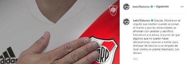 “Gracias. Mostraron el orgullo que sienten cuando se ponen el manto y que las adversidades se afrontan con carácter y sacrificio. Estuvieron a la altura, al punto de que algunos que no suelen hacer declaraciones, salieron a hablar para disfrazar de heróico a un empate de local contra un plantel diezmado. Los abrazo”, sostuvo Alonso de manera emotiva y contundente.