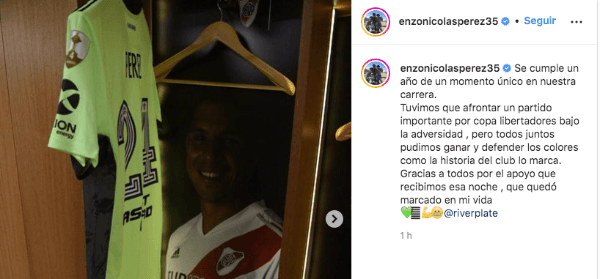 A 12 meses de semejante hazaña, el propio protagonista de esa noche emotiva recordó lo sucedido, cuando le tocó atajar por las bajas de Armani, Lux, Petroli y Bologna: “Se cumple un año de un momento único en nuestra carrera. Tuvimos que afrontar un partido importante por copa libertadores bajo la adversidad , pero todos juntos pudimos ganar y defender los colores como la historia del club lo marca. Gracias a todos por el apoyo que recibimos esa noche que quedó marcado en mi vida“, escribió Enzo en su cuenta de Instagram.