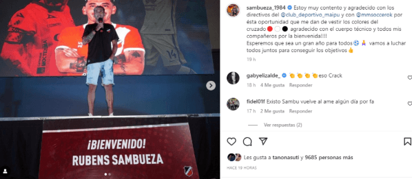 “Estoy muy contento y agradecido con los directivos de Deportivo Maipú por esta oportunidad de vestir los colores del Cruzado. Y agradecido a mis compañeros y cuerpo técnico por la bienvenida. Esperemos que sea un gran año para todos y vamos a luchar todos juntos para conseguir los objetivos”, expuso Sambueza en sus redes sociales sobre su flamante llegada a Mendoza. Cabe destacar que Rubens tuvo dos etapas en River, ya que había regresado a Núñez para la temporada 2009. En total disputó 51 partidos oficiales con la banda roja y marcó seis goles.
