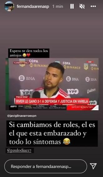 Afortunadamente el malestar no pasó a mayores y el marcador central de River pudo completar los 90 minutos sin mayores inconvenientes, pero toda esta situación derivó en una cómica ocurrencia de su esposa Fernanda Arenas. Es que la pareja del chileno subió una historia a su cuenta de Instagram donde se lo ve a Díaz contando los detalles de su estado de salud antes del inicio, y allí llegó la burla.
