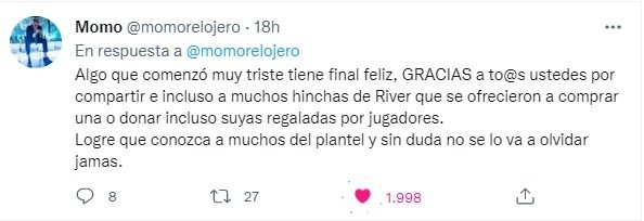 Gerónimo Benavides, popularmente conocido como Momo, es uno de los streamers más reconocidos del momento y él mismo tomó nota de lo sucedido. Momo se contactó con allegados al plantel de River, puntualmente con Agustín Palavecino y en menos de una semana lo que para Joaquín fue una experiencia horrible pasó a ser una de las mejores de su vida.