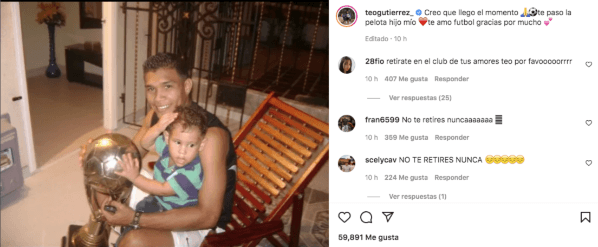 Justo cuando River estaba jugando su partido contra Alianza Lima, el colombiano posteó una foto con su hijo Cristiano Gutiérrez: “Creo que llegó el momento. Te paso la pelota hijo mío. Te amo fútbol. Gracias por mucho“, escribió de forma inesperada. Obviamente que sus palabras repercutieron en todos lados pero sobre todo en Colombia, al tratarse de su posible retiro. El próximo 17 de mayo, Teo cumplirá 37 años y parece que ya empieza a imaginarse lejos del fútbol…