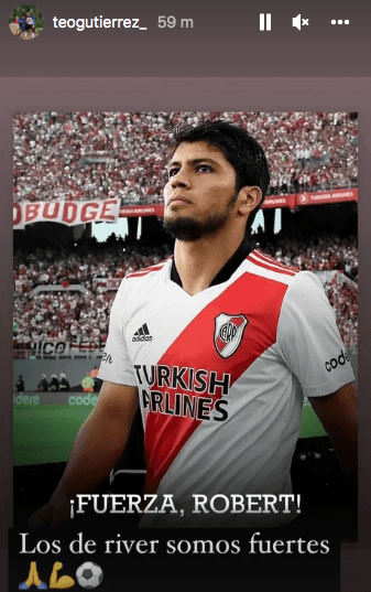 Teo también se hizo eco de la noticia de la grave lesión de Robert Rojas en Perúy le dejó un mensaje al estilo Teo, compartiendo la foto de “Fuerza Rojas” que subió la cuenta oficial de River ayer por la noche y con las palabras “Los de River somos fuertes”.