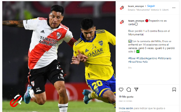 En las redes sociales también primó la cautela y el perfil bajo de los protagonistas. La excepción a la regla fue “Team Enzope”. Si bien no se trata de un posteo personal del mendocino,la cuenta que gestiona supágina oficial publicóuna foto del volante de River disputando el balón cuerpo a cuerpo con Juan Ramírez y una leyenda: “Tropezón no es caída”.