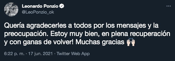 Ante la gran cantidad de mensajes y preguntas, el capitán se expresó en sus redes sociales y agradeció tantas muestras de cariño por parte de los hinchas. “Quería agradecerles a todos por los mensajes y la preocupación. Estoy muy bien, en plena recuperación y con ganas de volver! Muchas gracias”, escribió el León, que en los próximos días volverá a Las Rosas, el pueblo santafesino de donde es oriundo, para comenzar la recuperación.
