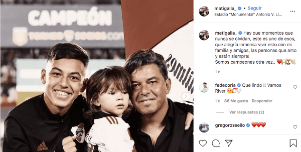 Matías juega en la Cuarta División de River y sueña con ser dirigido por su papá en Primera, mientras tanto disfruta de cerca de los los logros de su viejo. “Hay que momentos que nunca se olvidan, este es uno de esos, que alegría inmensa vivir esto con mi familia y amigos, las personas que amo y están siempre! Somos campeones otra vez”, escribió el juvenil en su cuenta de Instagram junto a una foto de él con el Muñeco y Benjamín, el más pequeño de sus hermanos.