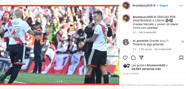 Terminado el encuentro, Zucu habló con ESPN sobre lo acontenido en Mendoza y dejó grandes palabras tanto para Gallardo como para Pinola. “Fue un padre para mí, siempre quiso darme lo mejor. Siempre me ha dado consejos desde lo más personal“, dijo sobre el Muñeco. Mientras que sobre el zaguero central añadió: “Es un ejemplo de jugador, de persona de lider, me llevo todos los recuerdos y las enseñanzas“.