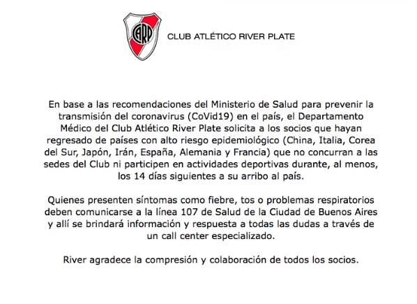 El coronavirus levanta la preocupación en todo el mundo y, ante la decisión de varios países europeos se jugar sus partidos sin público, River Plate sacó un comunicado oficial para que los socios e hinchas tomen recaudos respecto a la enfermedad. ¡Mirá el pedido del Departamento Médico del club!