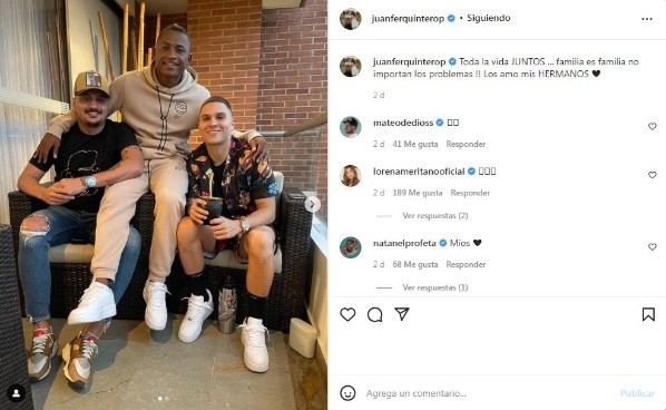 Actualmente Juanfer se encuentra descansando en Medellín, su ciudad natal. En los últimos días compartió una imagen en su cuenta de Instagram con dos futbolistas y amigos, se trata de Iván Ceballos Zapata y Fabio Burbano. En la publicación Juanfer escribió: “Toda la vida JUNTOS… familia es familia no importan los problemas !! Los amo mis HERMANOS”. Hay que recordar que cuando la liga de China estuvo parade durante más de dos meses el volante regresó a Colombia y se entrenó con el DIM para no perder ritmo, pero sabido es que Juanfer disfruta mucho de volver a su país y compartir con su familia y amigos.
