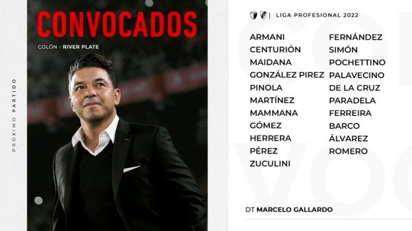 El once inicial que utilizaría el Muñeco para enfrentar al Sabalero estaría conformado por Franco Armani; Emanuel Mammana, Jonatan Maidana, Héctor David Martínez, Elías Gómez; Enzo Pérez; Santiago Simón, Enzo Fernández, Nicolás De La Cruz, Esequiel Barco; Julián Álvarez.