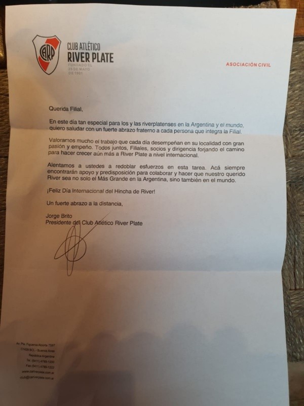 Gracias a esta acción, la Filial recibió un obsequio por parte de la institución: una carta del propio Presidente de River, Jorge Brito, en la que reconoce el trabajo realizado. Además, les hizo llegar a través del Consulado una camiseta con el 9 en la espalda y el nombre de la filial, que formará parte del museo que poseen en elMonumental de Málaga.