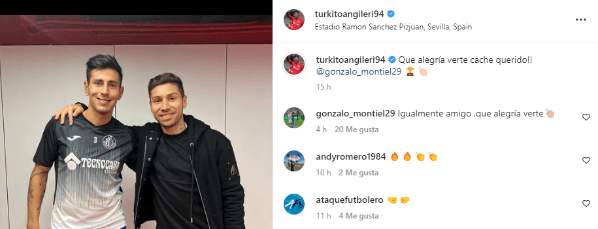 El contacto entre ambos se produjo en la previa del partido entre Sevilla y Getafe, camisetas que defienden actualmente Cachete y el Turco. “Qué alegría verte, Cache querido” fueron las palabras de Angileri en su cuenta de Instagram, a lo que Montiel lo retribuyó con lo mismo. Fue victoria 2-1 para el Sevillal, aunque ninguno de los dos estuvo presente en cancha. El lateral derecho porque estaba suspendido por acumulación de amarillas, y el zurdo porque fue al banco de suplentes y no ingresó al juego.