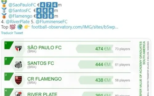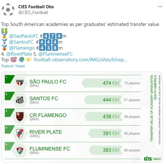El criterio utilizado por el CIES no es caprichoso: considera el dinero generado en los últimos mercados de pases por la transferencia de los jugador formados en las divisiones juveniles de cada club. Además, tuvo en cuenta aquellos jugadores que permanecieron al menos tres años en la institución, entre los 15 y los 21 años de edad. Y en ese ítem, con la venta de Julián Álvarez y Enzo Fernández a la cabeza, el Millonario saca enormes ventajas con respecto al resto. Solamente es superado por tres elencos sudamericanos: Sao Paulo, Santos y Flamengo. El primer equipo argentino que aparece después de River es Boca, en el puesto 26. Muy lejos.