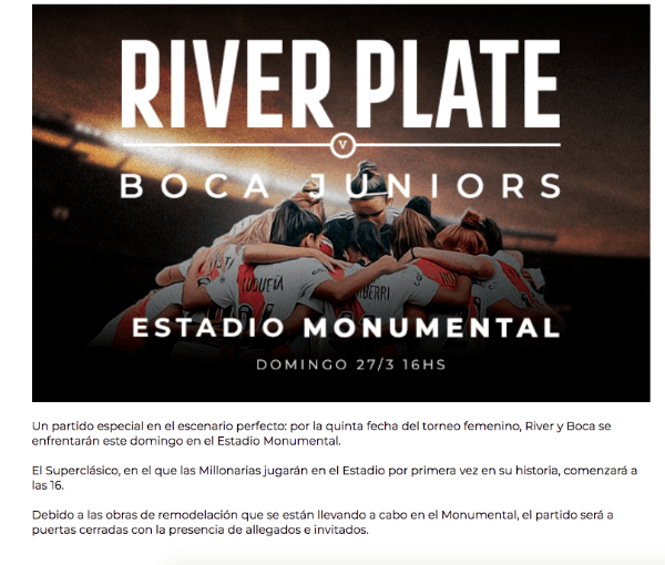 El fútbol femenino viene creciendo a pasos agigantados desde hace varios meses y River fue uno de los pioneros en la difusión del deporte, por eso hoy es uno de los equipos más fuertes y que más lugar le da a las jóvenes que quieren empezar a practicarlo en edades juveniles. Una deuda pendiente que tenía el club era darle el lugar al plantel profesionalfemenino para que disputaran, siempre que la agenda lo permitiera, sus partidos en el Estadio Monumental al igual que el plantel masculino.
