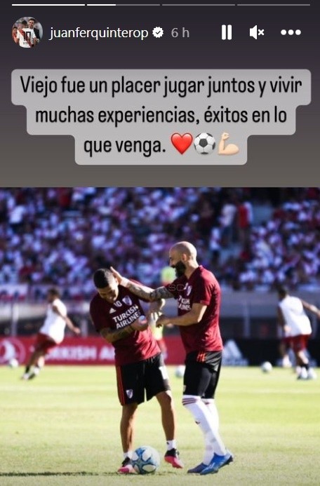 A pesar de estar concentrado con la Selección Colombia y de no haber podido estar junto a Pinola en su último partido como jugador profesional, Juanfer Quintero fue uno de los que abrió sus historias de Instagram para publicar: “Viejo, fue un placer jugar juntos y vivir muchas experiencias. Éxitos en lo que venga”, expresó el enganche cafetero.