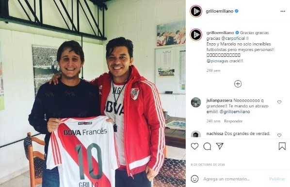 En 2016 Emiliano Grillo recibió una camiseta del Más Grande con el número 10 y su apellido en la espalda, por entonces compartió una foto a su cuenta de Instagram junto a Marcelo Gallardo en la que le agradecía al club y al Muñeco y Enzo Francescoli a quienes valoró como persona. Pero también utilizó unos zapatos especiales en 2018 con el escudo del Más Grande y en lugar del CARP estaba la G de Grillo.