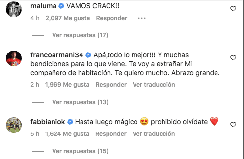 En el posteo de Instagram del Nalgón, hubo miles y miles de comentarios de simpatizantes de River y también destacaron algunos de sus propios compañeros, como Franco Armani y Nicolás De la Cruz. “Apá,todo lo mejor!!! Y muchas bendiciones para lo que viene. Te voy a extrañar Mi compañero de habitación. Te quiero mucho. Abrazo grande”, puso Armani. “Te amo hermano ! Siempre juntos”, escribió De la Cruz.