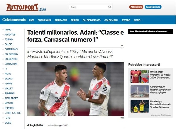 “Aquí está Higuaín, pero la cabeza está en River”, señala Tuttosport, en su portada de hoy, haciendo alusión a que el goleador ya está en Turín luego de varias semanas Argentina. Y agrega: “La Juve piensa en Carrascal”. La prensa italiana insiste en que el Pipita podría retornar a Núñez en una operación que incluiría al colombianoJorge Carrascal o incluso el juvenil Julián Álvarez.