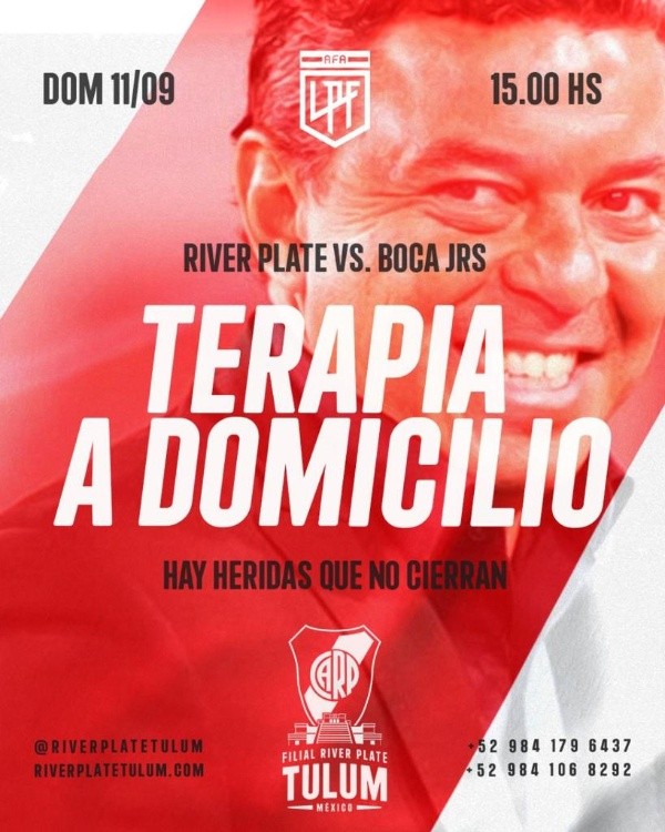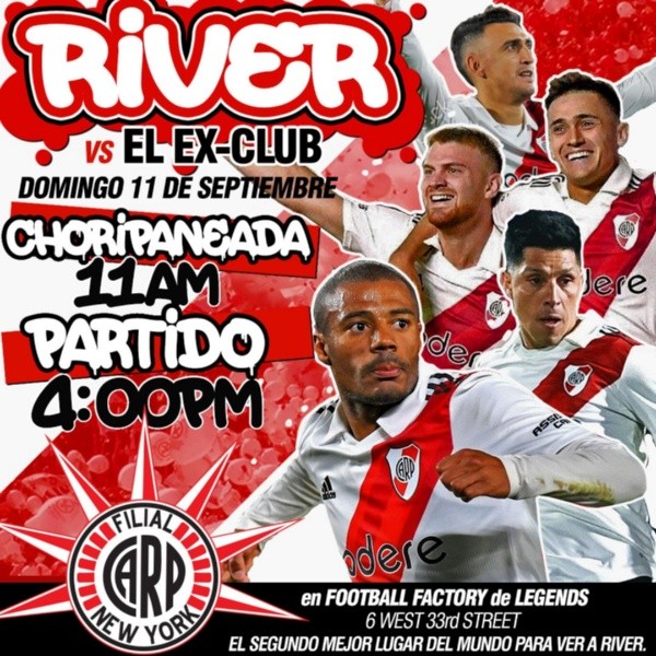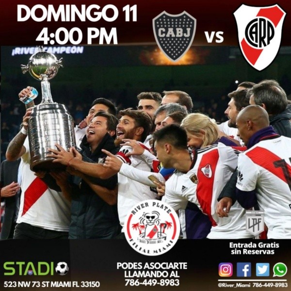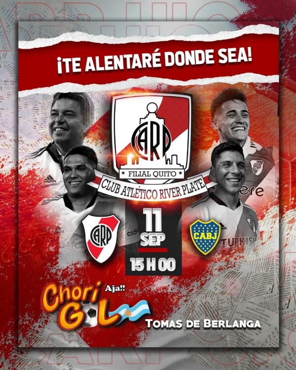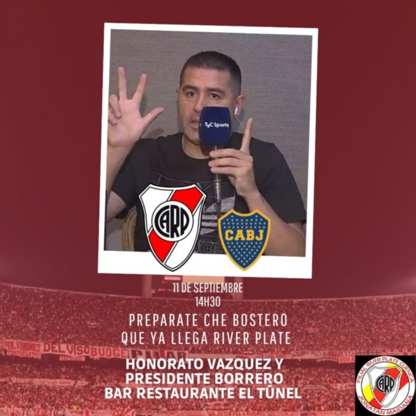 Las filiales internacionales del Más Grande se juntarán a ver el superclásico y aportar toda la pasión y el colorido habitual en cada rincón del planeta. En algunos casos y por la diferencia horaria, tendrán que aguantar hasta altas horas de la noche para alentar al equipo de Marcelo Gallardo. Es el caso de Armenia, donde la convocatoria está prevista para las 23.30 horas. Y también está el ejemplo de Nueva Zelanda, donde seguirán el derby argentino a partir de las 7.30 de la mañana del lunes 12 de septiembre.