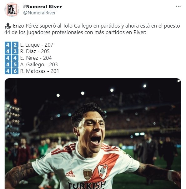 Enzo no sólo superó al Tolo, sino que además está a punto de batir un nuevo récord: ahora está en el puesto 44 dentro de los jugadores que tienen más presencias en la Primera de River. Según informó la cuenta @NumeralRiver, el mendocino quedó a un encuentro de alcanzar a Ramón Díaz, un ídolo de la institución, y a solamente tres de Leopoldo Jacinto Luque, otro futbolista que sabe lo que pesa una Copa del Mundo con la Selección Argentina. Un símbolo de una época plagada de títulos, que va camino a ocupar un lugar en la bandera de los jugadores más icónicos de la historia del club.