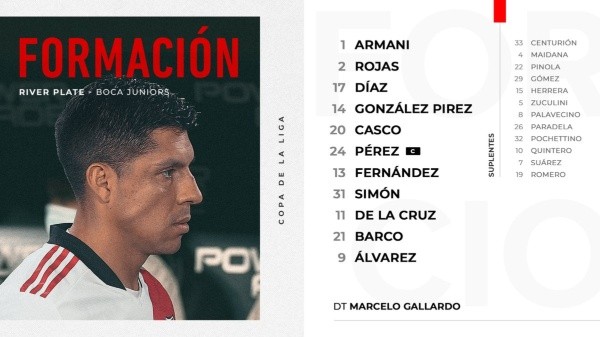 El Muñeco decidió que los 11 que salgan a la cancha contra el eterno rival sean: Franco Armani; Robert Rojas, Paulo Díaz, Leandro González Pírez, Milton Casco; Enzo Pérez; Santiago Simón, Enzo Fernández, Nicolás De La Cruz, Esequiel Barco; Julián Álvarez. De esta manera Marcelo Gallardo repite el mismo equipo que viene de ganar, gustar y golear ante Gimnasia de La Plata el pasado domingo en el Monumental.
