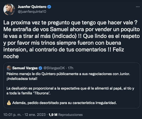 El Nalgón había posteado una foto de Carlos Valderrama, histórico jugador de Junior y de Colombia, y muchos aficionados lo tomaron como una pista de que iba a terminar firmando en Barranquilla. Incluso, se cruzó con un periodista en Twitter que lo acusaba de haber generado falsas ilusiones a los hinchas. “La proxima vez te pregunto que tengo que hacer vale?”, respondió el ex 10 del Millo.
