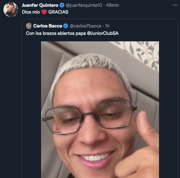Minutos antes de la oficialización de su pase, Juanfer citó un tweet de Carlos Bacca, otro histórico jugador de la Selección Colombia y actual delantero de Junior, que escribió “Con los brazos abiertos papá” y una foto del zurdo sonriendo en una videollamada que mantuvieron en las últimas horas. Parecía que era un tweet a modo de broma, pero terminó siendo el anuncio anticipado del desembarco de Juanfer en Junior, cuando parecía que era imposible y que su destino enfilaba hacia Brasil. ¿Los tweets habrán sido un juego? Solo él lo sabrá…