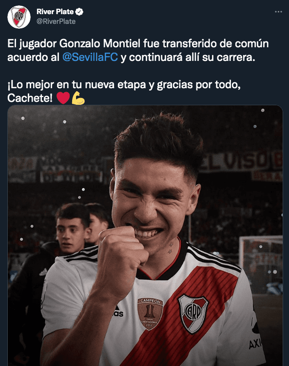 “El Sevilla FC ha confirmado un nuevo refuerzo de cara a la campaña 2021/22 con la llegada deldefensa internacional argentino Gonzalo Montiel.Procedente de River Plate, lugar donde ha desarrollado su carrera futbolística hasta la fecha,el lateral diestrofirma por las cinco próximas temporadas con la entidad nervionense“, escribió el club andaluz en un comunicado oficial, donde luego detalla toda la trayectoria de Cachete en el Más Grande.