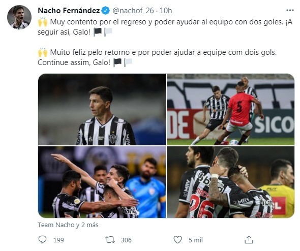 Por la octava fecha del Brasileirao se enfrentaron Atlético Mineiro y Atlético Goianense, el duelo se jugó en el Mineirao y el vencedor fue el conjunto de Belo Horizonte que se impuso por 4 a 1. Los goles fueron dos dobletes, el primero lo hizo el ex Racing Matías Zaracho y la frutilla del postre estuvo en los pies de Nacho Fernández que regresó a las canchas tras superar el Covid y jugó un partido extraordinario, tal como solía hacer en River. Con este resultado el Galo escaló a la quinta posición de un torneo que es muy largo, desgastante y que se continúa jugando pese a la Copa América que justamente se desarrolla en Brasil.