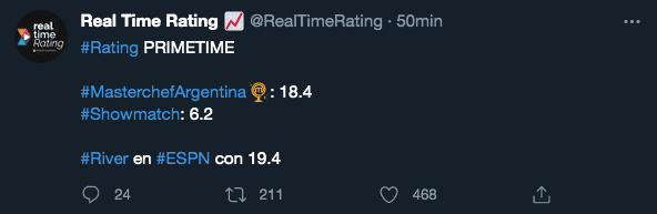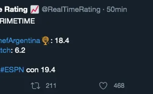 En el primer tiempo, el encuentro tuvo picos de 20,3 puntos de rating, casi más que todos los canales de aire juntos. Llegando a los 21.00 en los últimos minutos del partido, eEl promedio final fue de 19.3, algo histórico y que cuentas que se encargan de la cobertura del rating en la televisión argentina, como @RealTimeRating,lo comparan con números de “un partido de un Mundial”. Superó de forma holgadaa dosgigantes televisivos como lo son el programa ShowMatch, conducidopor Marcelo Tinelli en El Trecey Masterchef, junto con la serie Doctor Milagro,que se tranmiten en Telefé.