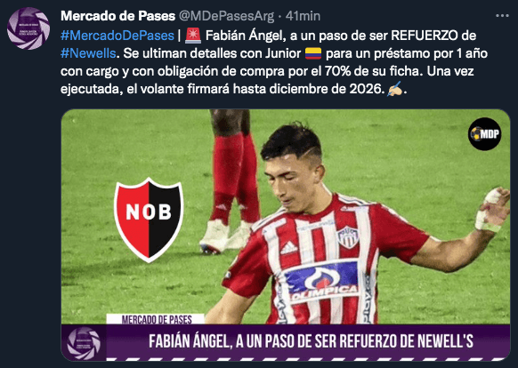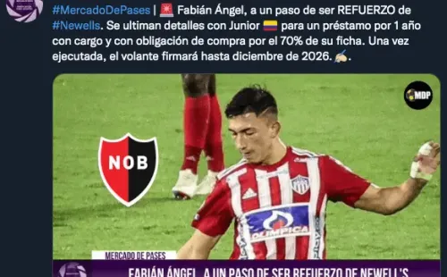 Ángel tiene casi acordada su llegada a la Lepra rosarina, que lo traerá a préstamo por un año con cargo y con una obligación de compra por el 70% de su pase (Junior posee el 100% de la ficha), y probablemente esté en cancha cuando River y Newell’s se cruzen por la fecha 13 de la Liga Profesional en el Estadio Monumental.