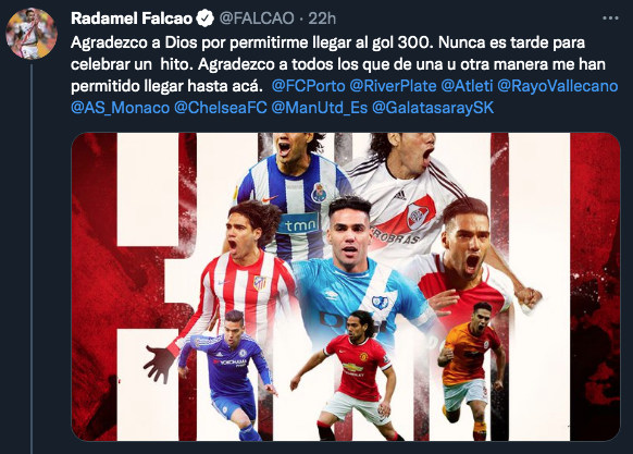 El Tigre, que no podrá jugar los encuentros de su Selección por Eliminatorias a raíz de la lesión, realizó un posteo anunciando la noticia de que había llegado a los 300 gritos, manteniéndose así como el máximo goleador colombiano a nivel internacional. “Agradezco a Dios por permitirme llegar al gol 300. Nunca es tarde para celebrar un hito. Agradezco a todos los que de una u otra manera me han permitido llegar hasta acá”, escribió el ex River.