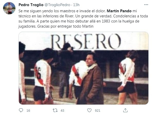 Dolor en el Mundo River por la partida de Martín Pando, un formador de raza que vivió en el Más Grande momentos inolvidables. Como jugador visitó el Manto Sagrado entre 1962 y 1964, luego regreso a Núñez en otra tarea: la de formar a los pibes de las Inferiores y así lo hizo por casi veinte años. Estuvo en el proceso que comandaba Delem y por 18 años fue quien le enseñó a miles de chicos los primeros secretos que más tarde serían determinantes para llegar a Primera.