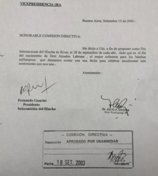 El 18de septiembre del 2003 la Comisión Directiva de Riveraprobó por unanimidad la iniciativaque en aquel momento fue impulsada por la Subcomisión del Hincha, donde se pedía que cada 28 de septiembre sea considerado como una fecha de celebración absoluta, debido al natalicio delenorme prócer que marcó para siempre la historia del club.