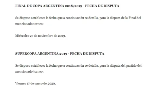 Por otro lado,la Supercopa Argentina (que fue ganada por River ante Boca en el año 2018)tendrá su cita el día viernes 17 de enero de 2020 -el horario aquí también es una incógnita.