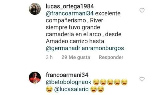 En las últimas horas el Beto subió una publicación a su Instagram festejando el triunfo del equipo en Mendoza, y allí uno de los primeros en felicitarlo fue ni más ni menos que Franco Armani. “Grande Beto querido”, escribió el Pulpo junto con emojis ligados a aplausos. Y allí Bologna respondió fiel su estilo y con su sentido del humor habitual. “Grande de edad me estás diciendo?? Jajaja tené cuidado ahí con Lucas Alario”, bromeó Bologna, quien luego de finalizado el partido había hablado maravillas de Armani.