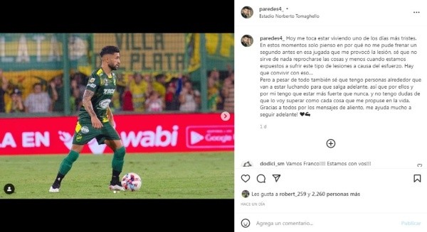 “Hoy me toca estar viviendo uno de los días más tristes. En estos momentos solo pienso en por qué no me pude frenar un segundo antes en esa jugada que me provocó la lesión, sé que no sirve de nada reprocharse las cosas y menos cuando estamos expuestos a sufrir este tipo de lesiones a causa del esfuerzo. Hay que convivir con eso. Pero a pesar de todo también sé que tengo personas alrededor que van a estar luchando para que salga adelante, así que por ellos y por mi tengo que estar más fuerte que nunca, y no tengo dudas de que lo voy superar como cada cosa que me propuse en la vida. Gracias a todos por los mensajes de aliento, me ayuda mucho a seguir adelante!”, escribió Franco Paredes en su cuenta de Instagram.