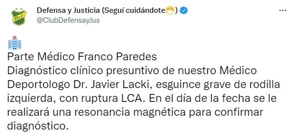 El Halcón recibió a Lanús por la última jornada de la Liga Profesional, desafortunadamente Franco Paredes fue reemplazado luego hacer un mal movimiento. En cuanto cayó al piso se notó la preocupación en sus compañeros y en los médicos que lo sacaron del campo de juego. Este lunes se dio a conocer el parte médico, Defensa y Justicia lo hizo público en su cuenta de Twitter: “Parte Médico Franco Paredes. Diagnóstico clínico presuntivo de nuestro Médico Deportologo Dr. Javier Lacki, esguince grave de rodilla izquierda, con ruptura LCA. En el día de la fecha se le realizará una resonancia magnética para confirmar diagnóstico”, hay que destacar que cuando se refiere a LCA es al ligamento cruzado anterior. Se estima que el tiempo de recuperación puede durar unos 6 meses.