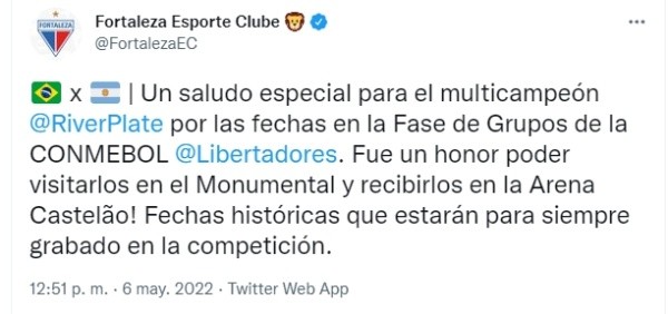 Luego del encuentro, Fortaleza manifestó todo ese respeto en sus redes sociales. Particularmente en su cuenta de Twitter, donde primero publicó una mensaje en portugués y acto seguido lo tradujo al español. ¿Qué decía el Twit? Un saludo especial para el milticampeón River Plate por las fechas en la Fase de Grupos de la Conmebol Libertadores. Fue un honor poder visitarlos en el Monumental y recibirlos en el Arena Castelão! Fechas históricas que estarán para simpre grabadas en la competición”. La mística no es algo que se consiga fácilmente en una competencia como la Libertadores y el equipo del Muñeco, a pesar de unos pocos detractores, viene cosechando todo lo que sembró a lo largo de estos años.